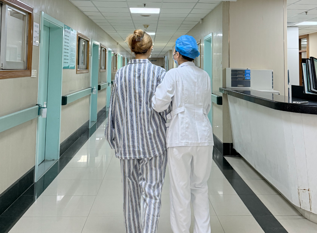 术后第三天,血栓基本清除,她已能下床自主行走,笑容重现脸庞。