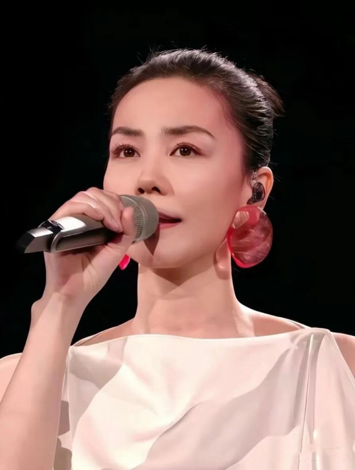 去年王菲上春晚,穿着一身无袖白色长裙,虽然妆容淡淡的,但虾片耳饰和太阳穴的红色眼影还是很独特的,让人有记忆点。