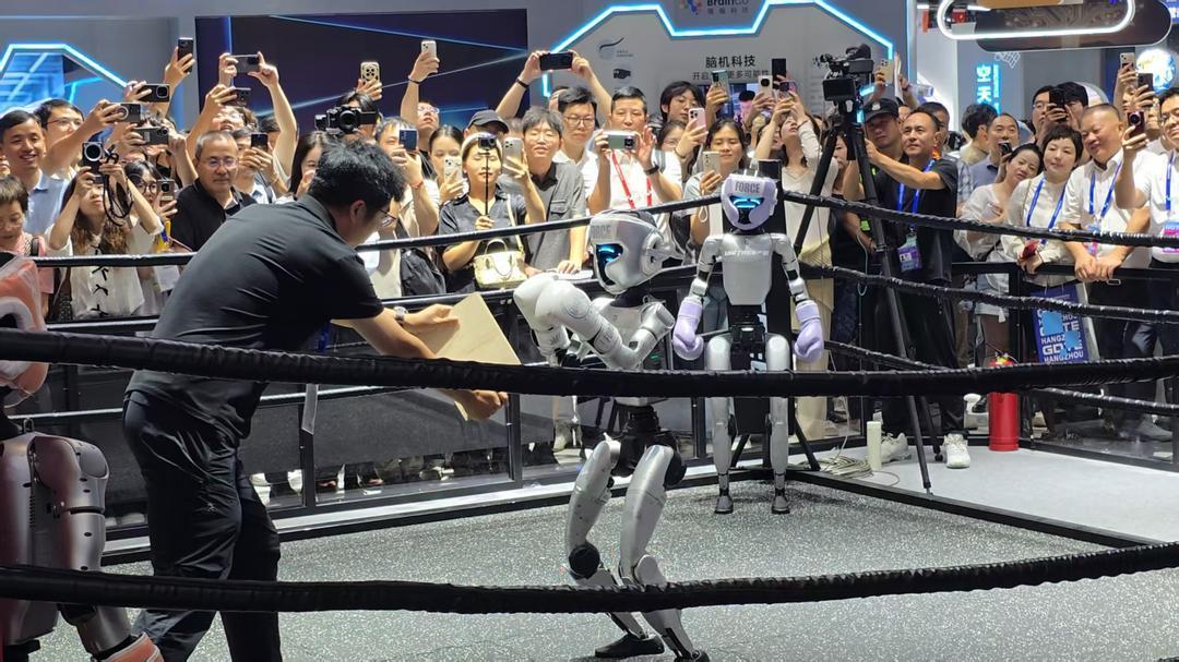 杭州大会展中心内,宇树科技的机器人正随着裁判的指挥进行着拳击比赛,而不远处的人工智能展厅,还有一组机器人在优雅地弹着钢琴......